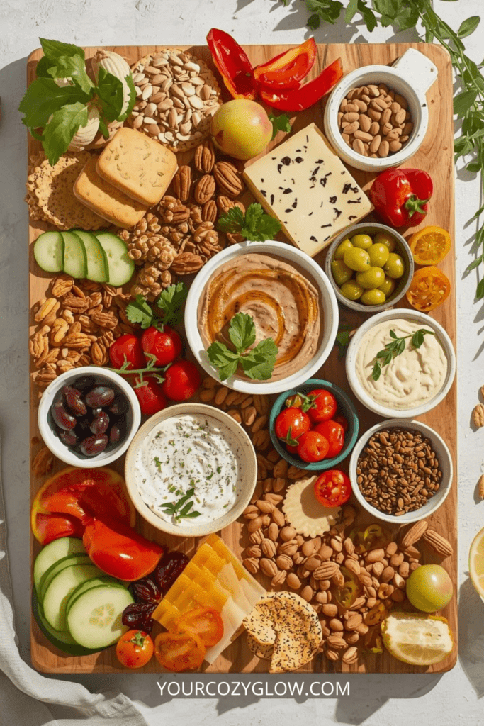 Mix raw and roasted vegetables for depth. Scatter nuts like pistachios or almonds to fill small gaps, and place dips in bowls for structure. This board should feel full of life — bright, fresh, and naturally abundant.