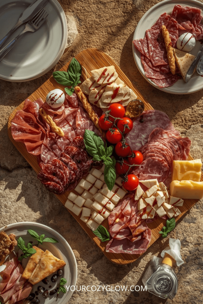 Let the board look artisanal — not too neat or perfect. Fold meats into ribbons, break cheese naturally, scatter olives freely. This is casual elegance, Italian-style.