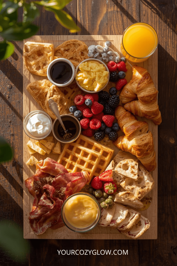 A breakfast board is comfort on display. Think steaming coffee, golden pastries, vibrant berries, warm eggs — all arranged beautifully and ready for grazing. This board is perfect for weekend mornings when nobody wants a formal plated breakfast but everyone wants something delicious.