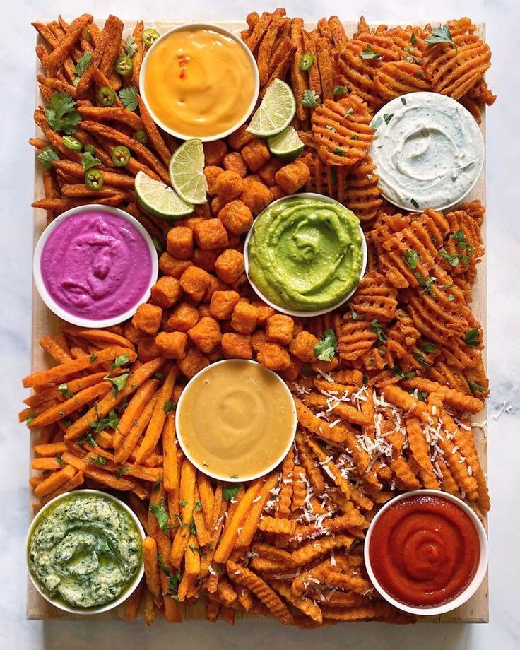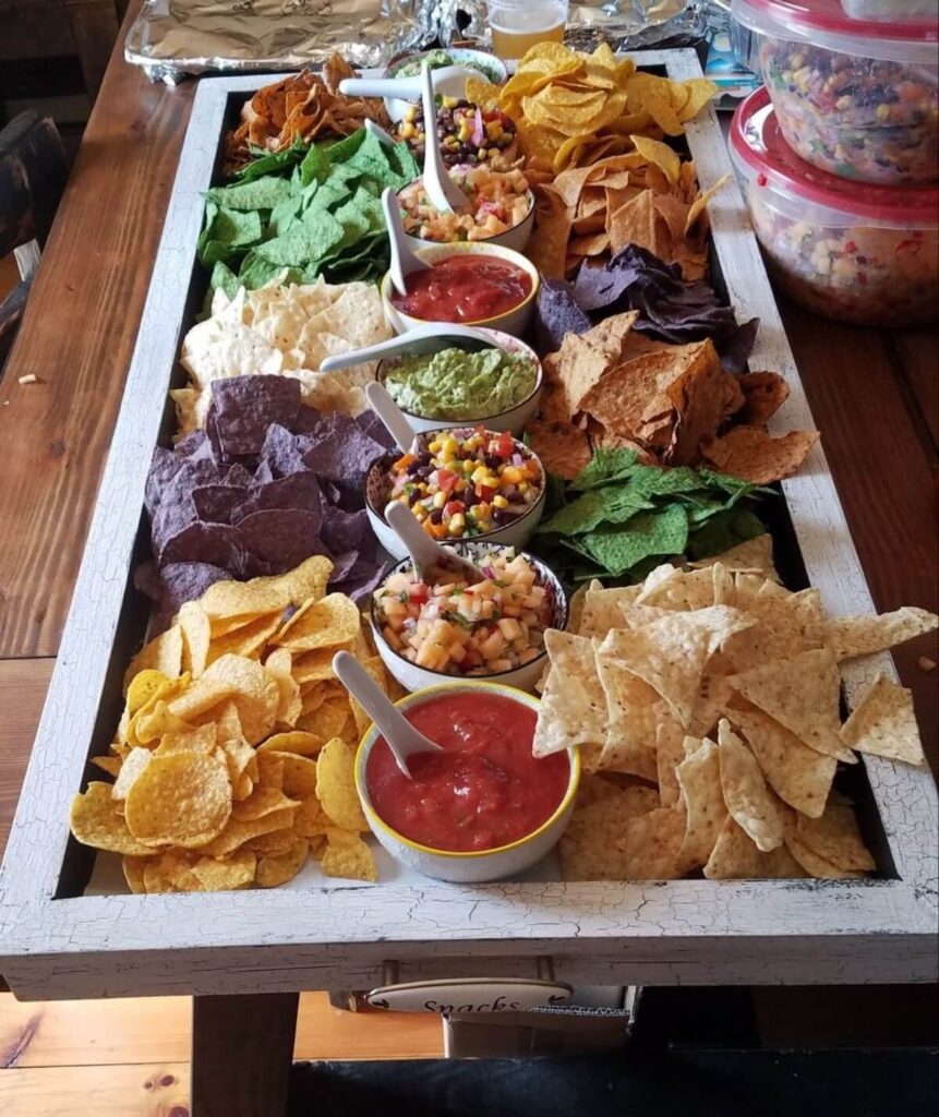 Simple, budget-friendly, and a crowd favorite! Offer a variety of chips, from classic potato chips to tortilla chips, and pair them with flavorful dips like guacamole, salsa, and queso.