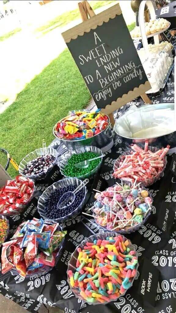 A candy bar is never a letdown! Make a table of several candies in glass jars or color bowls.