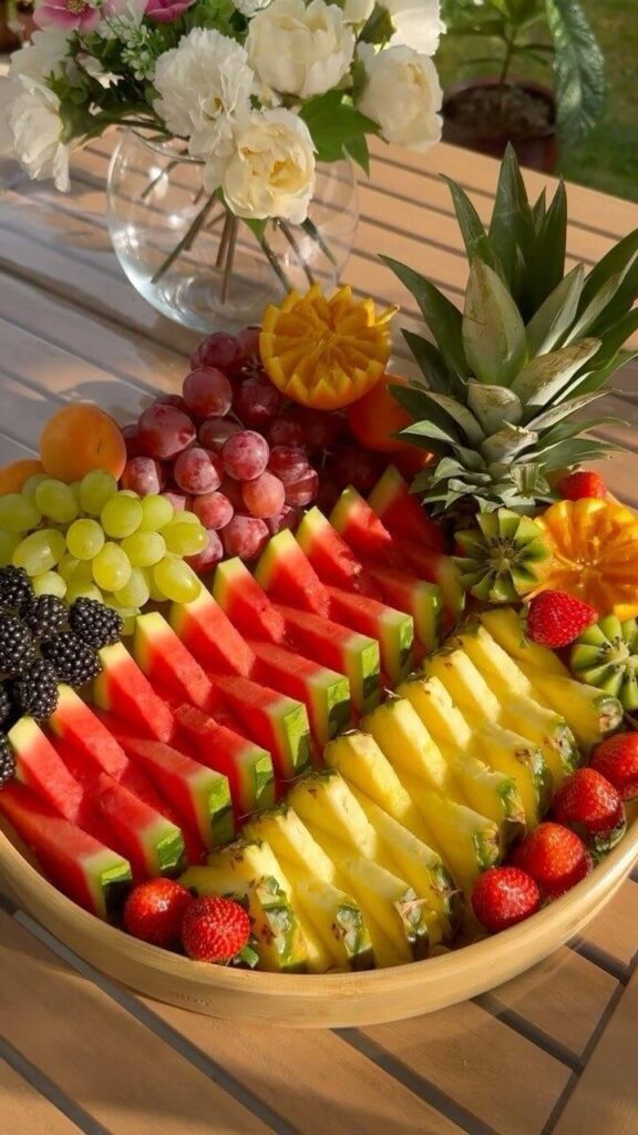 Try a combination of colorful fruits such as watermelon, berries, and pineapple. It’s light, colorful, and complements most other snack choices nicely.