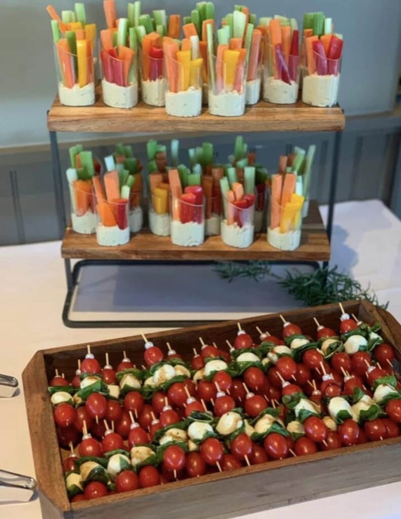 For a healthy, vegetable-based option, prepare a veggie bar with fresh veggies, hummus, caprese skewers.